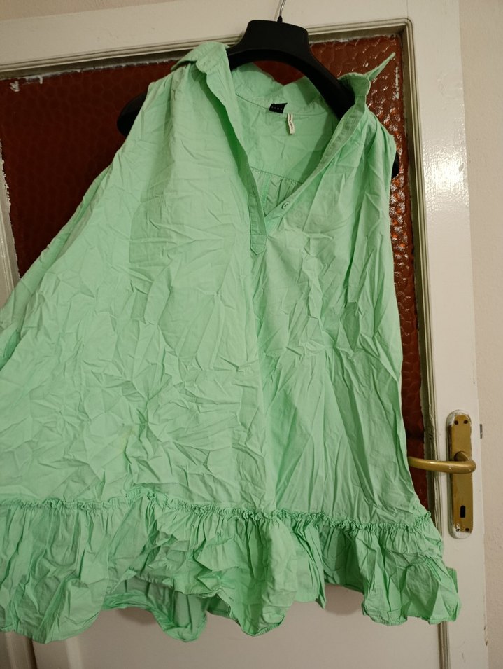 Parlak yeşil renkte, keten kumaştan yapılmış, fırfırlı ve uzun boylu, salaş kesim, kolsuz hamile tunik. Bohem tarzda günlük kullanım için uygundur. afra Saraçoğlu tasarım
