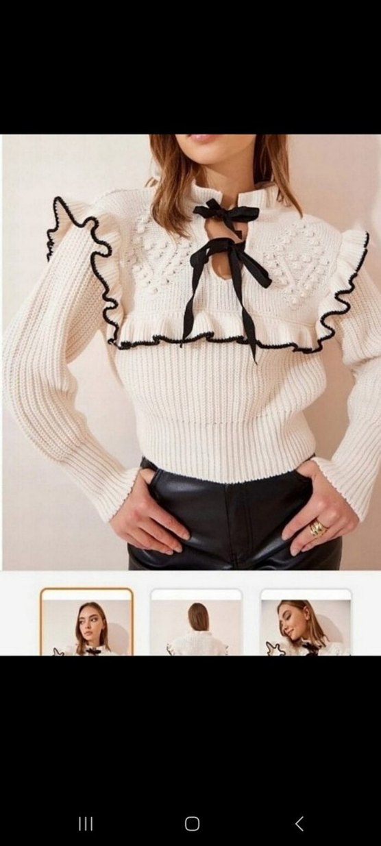 Fırfırlı V Yaka Beyaz Kısa Triko Kazak