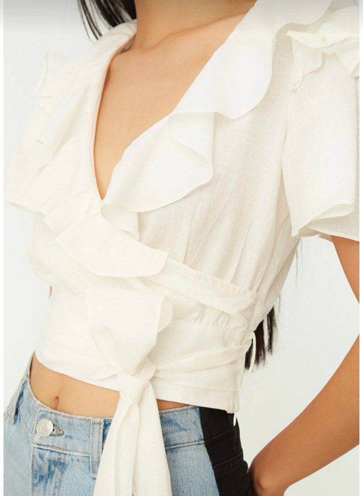 Fırfırlı V yaka, askılı kollar ve bağlamalı bel detayıyla beyaz keten bluz. Hafif keten kumaştan, normal midi boyda, günlük kullanıma uygun.