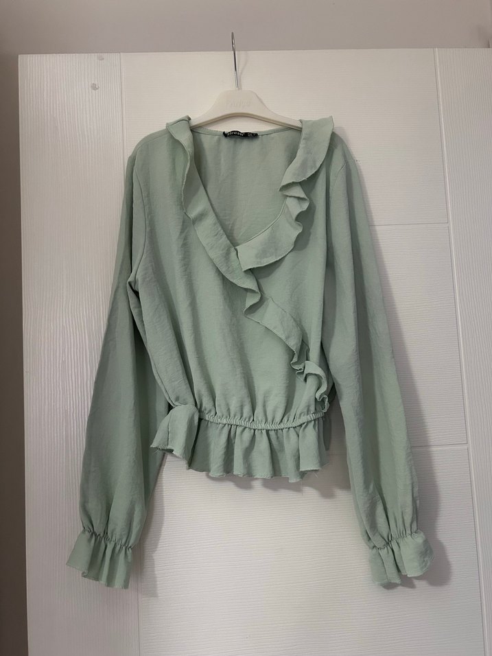 Pastel yeşil renkte, uzun kollu, V yaka ve fırfır detaylı keten bluz. Rahat kesimi ve günlük kullanıma uygun tarzıyla dikkat çeker.