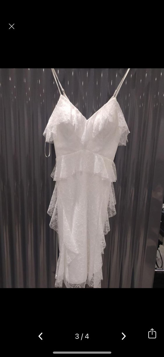 Bu beyaz abiye elbise, V yakası, ince askıları ve zarif fırfır detaylarıyla dikkat çeker. Nakışlı, bohem Paris tarzında, düğünler için uygundur.