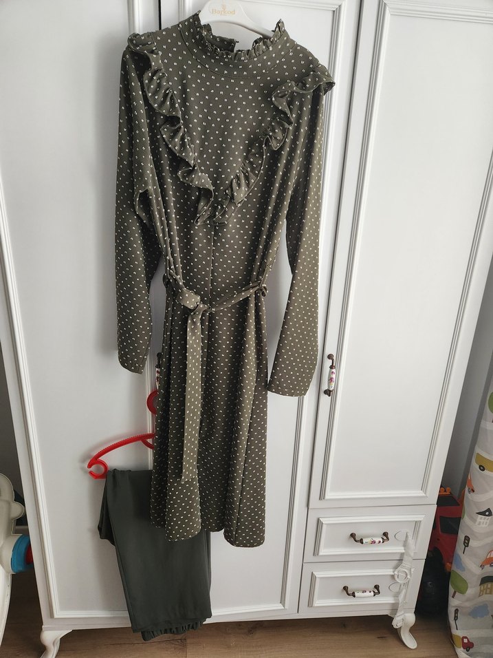 Yüksek yakalı, uzun kollu ve kemerli yeşil tunik takim, yumuşak sentetik kumaştan üretilmiş. Fırfır detaylı ve regular fit, şık bir sokak stili için uygun. Pantolonu dugmeli arka kismi lastiklidir. 40 beden