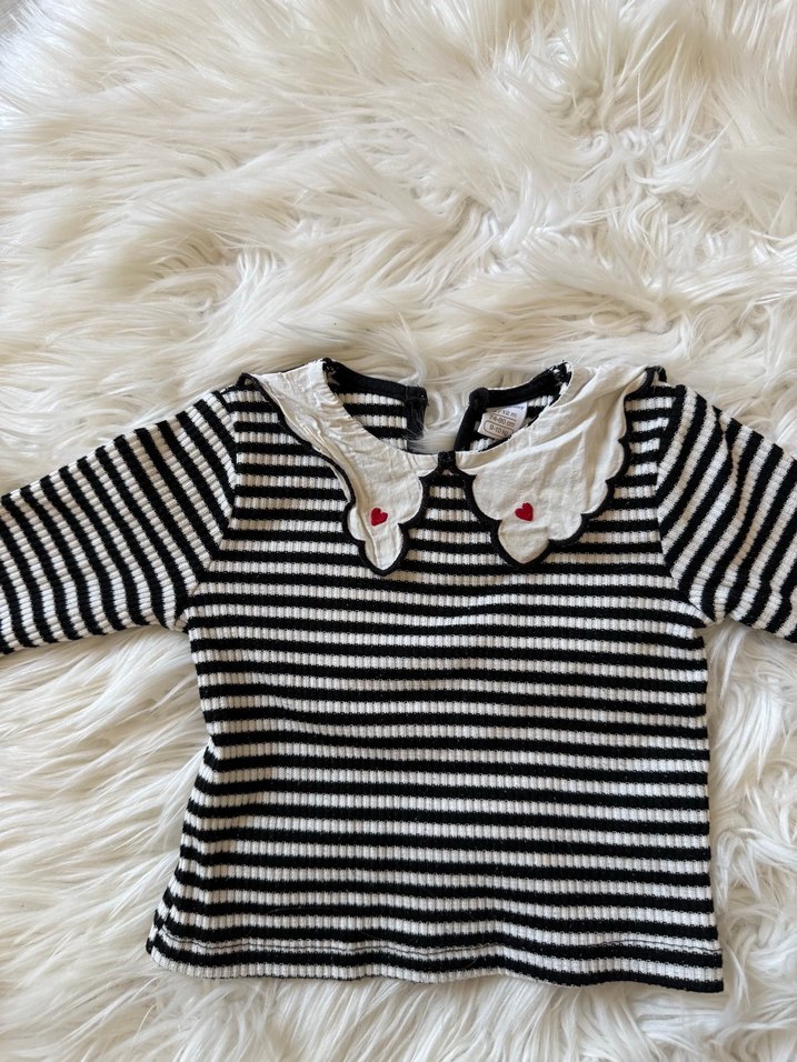 Yumuşak triko kumaştan yapılmış, siyah beyaz çizgili, uzun kollu ve vücudu saran kesime sahip kız bluzu. Fırfırlı yakası ve küçük kırmızı kalp detayları bulunur.