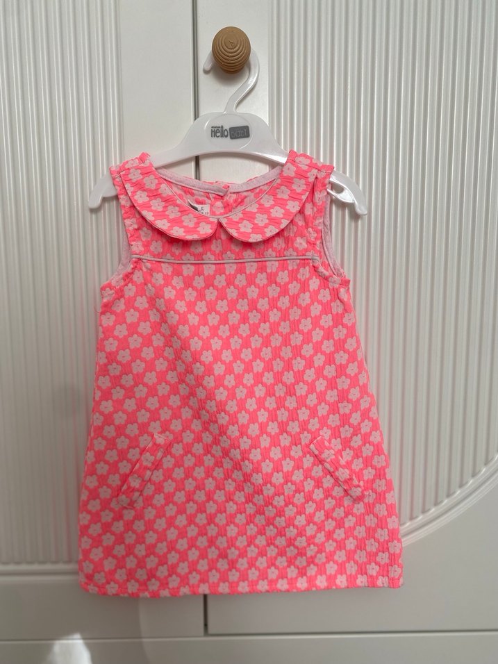 Kolsuz, yakalı ve fırfırlı detaylara sahip pembe kız çocuk elbisesi, renkli baskılı ve vintage tarzda, vücuda oturan kesimdedir.