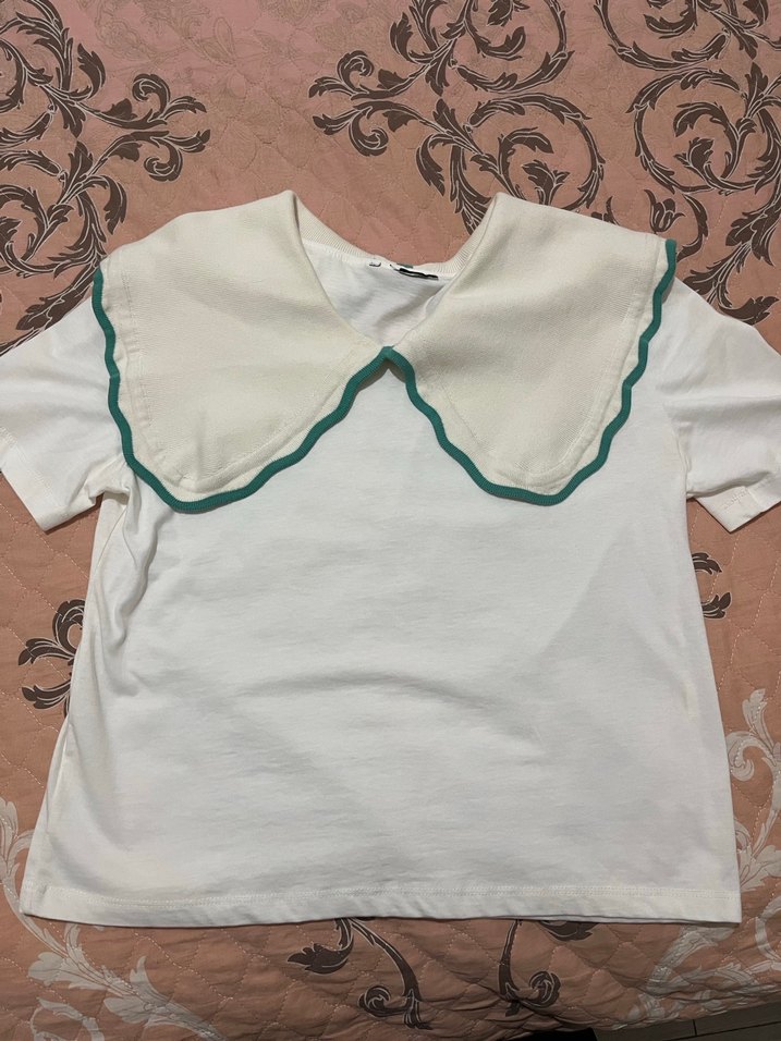 Yeşil şeritli fırfırlı yakası ve pamuklu kumaşıyla rahat kesim beyaz kısa kollu tişört. Günlük ve sokak stiline uygun.