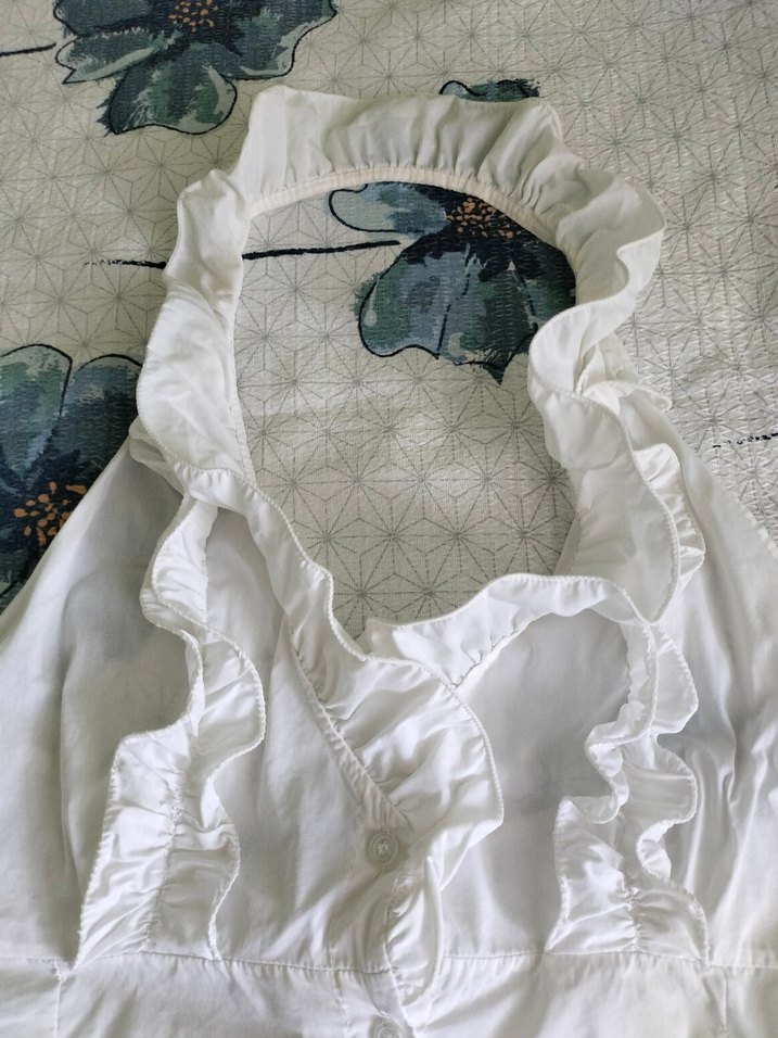 Keten kumaştan, fırfırlı yakalı ve kolsuz bluzu. Bohem tarzda, vücuda oturan kesimiyle günlük kullanıma uygun.