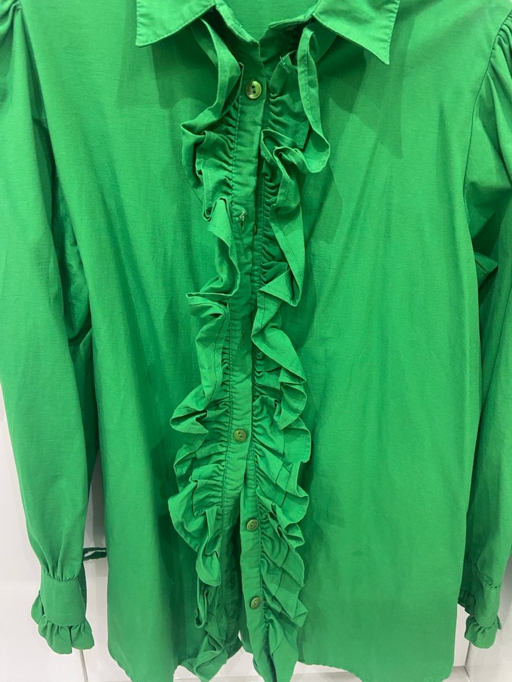 Yeşil keten gömlek, uzun kollu, yakalı ve ön ile manşetlerde fırfır detaylıdır. Salaş kesim, parlak dokunuş ve ofis kullanımı için uygundur.
