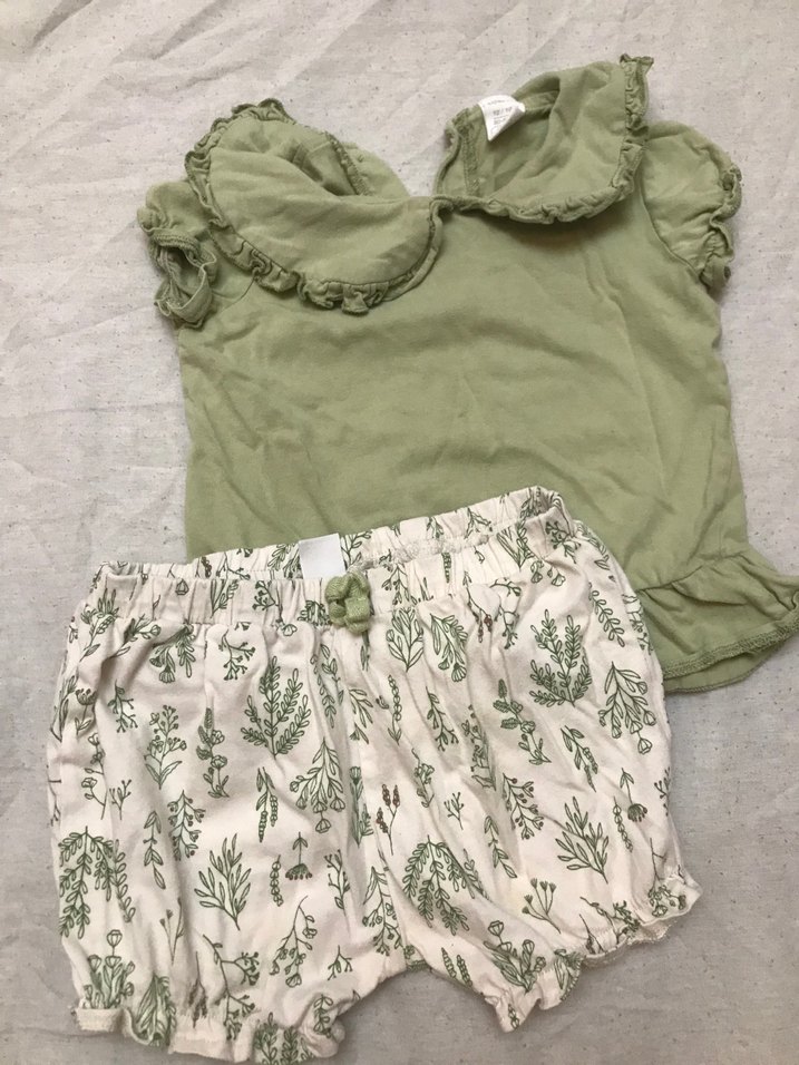 Fırfırlı, kısa kollu pastel yeşil üst ile krem rengi, yeşil bitki desenli şorttan oluşan kız bebek takımı.