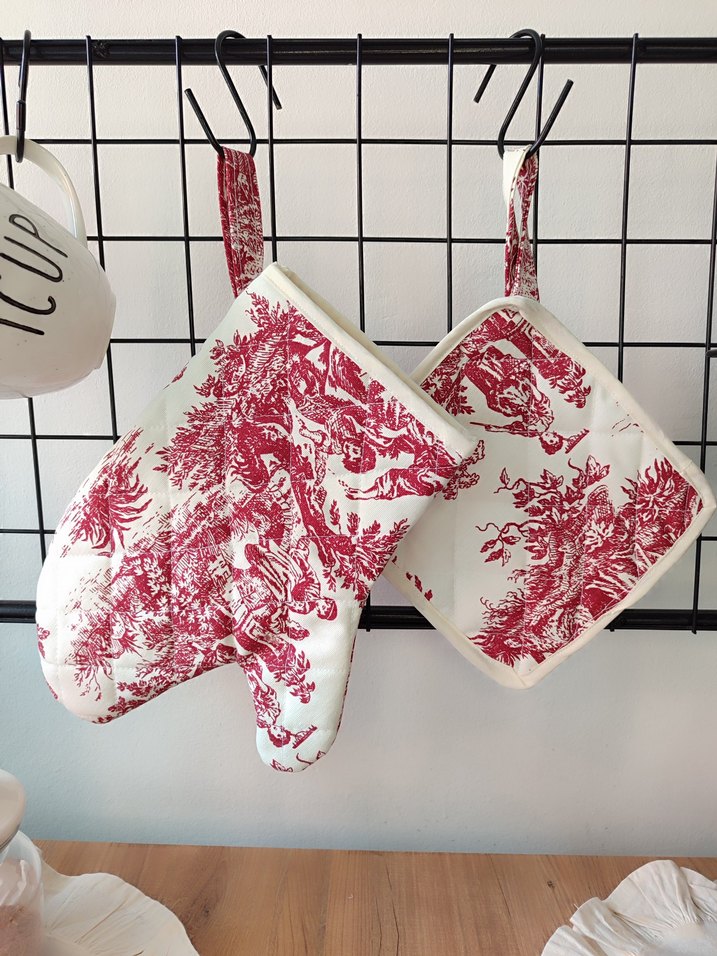 Kırmızı Fransız köylü desen kapitoneli elyaf dolgulu ısıya dayanıklı fırın eldiveni seti. Duck kumaşından özel olarak üretilmiştir.30 derecede yıkamaya uygundur.
