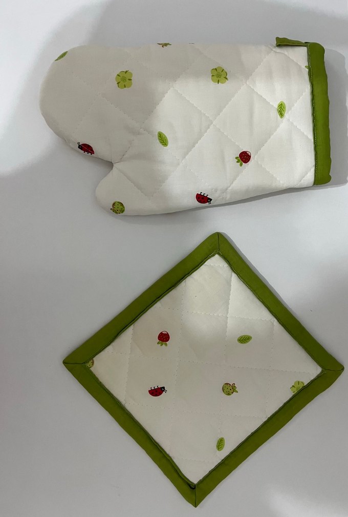 Renkli desenlere sahip beyaz fırın eldiveni ve tutacağı, yeşil kenarlıklıdır. Sıcak koruma için kapitone işlemelidir. Sıfır üründür hiç kullanılmadı yeni durumdadır.
