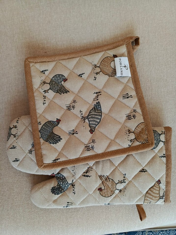 Kahverengi horoz desenli, fırın eldiveni ve tutacak seti, asma halkası bulunur.