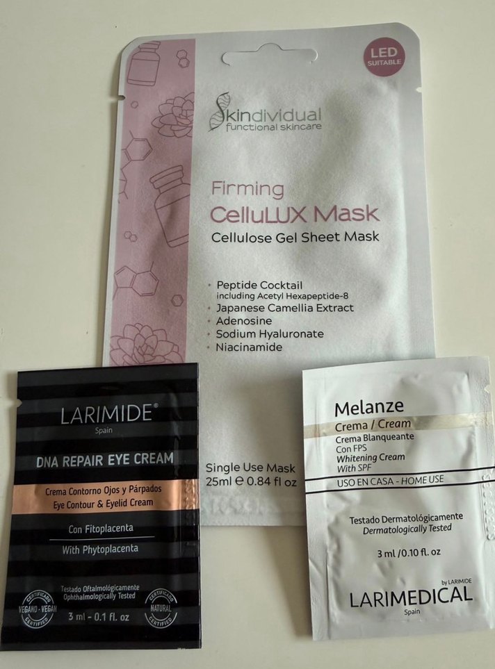 Peptidler, Japon kamelya özü, adenosin, sodyum hiyalüronat ve niasinamid içeren CelluLUX sıkılaştırıcı jel maske ve DNA onarıcı göz kremi seti. Avusturalya’dan aldım.
