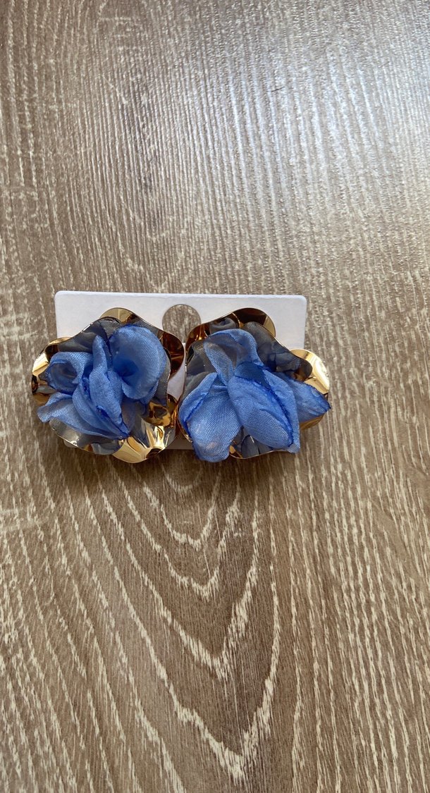Parlak mavi kumaş fırfırlı çiçek desenli, kısa uzunlukta vintage bohem tarzda düğün için uygun küpe. Hiç kullanılmadı