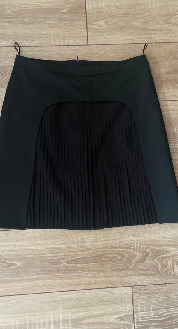 42 beden 2 kez giyildi. Düz siyah midi etek, piliseli ön detaylarla regular fit kesime sahip. Pürüzsüz kumaştan Ofis kullanımına uygundur. İADE ALMIYORUM****