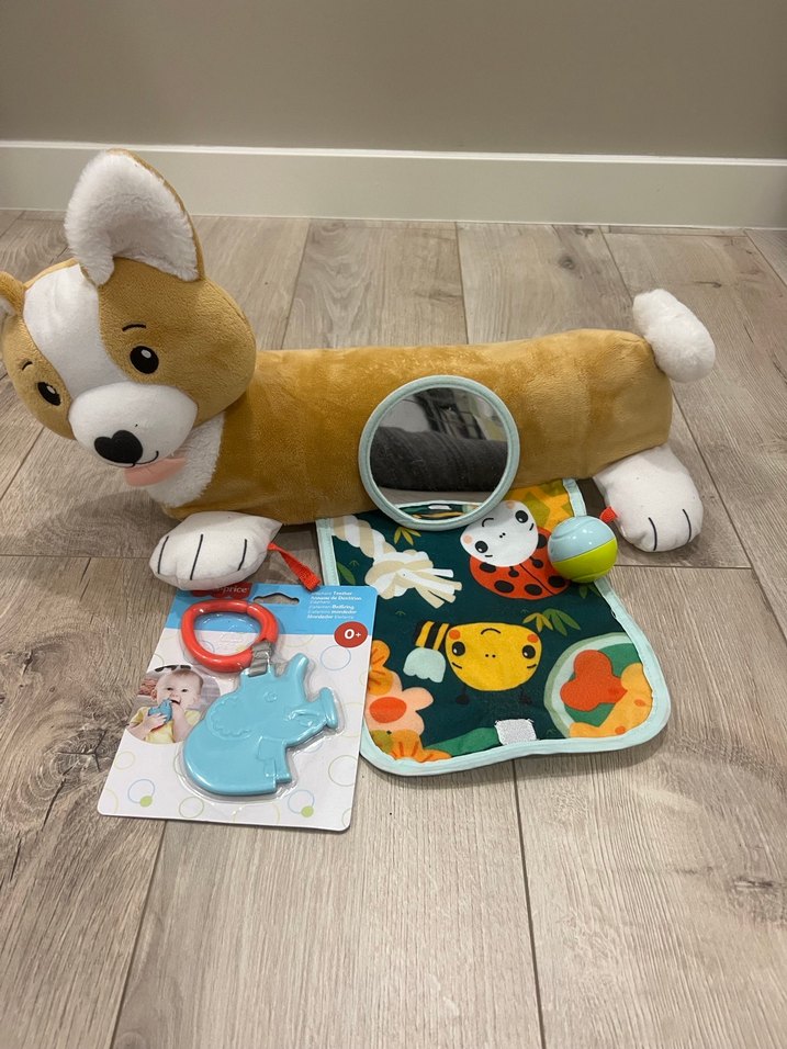 Açık renkli kamel tonlarında köpek figürlü peluş oyuncak, ayna, renkli hayvan desenli bez ve bebek diş kaşıyıcıları içeren eğitici oyuncak seti. Dişliğini bebeğim ısırdığı için sıfır göndereceğim