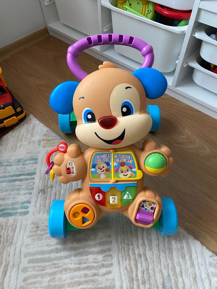 Renkli, gülen köpek şeklinde bebek yürüteci. Etkileşimli düğmeler ve hareket kolaylığı için tekerlekler bulunur. Destek için tutma sapı içerir. Herhangi bir sorunu yoktur. Çalışır durumda. Kutusuna geri koyduk, kutusuyla gönderilecektir.