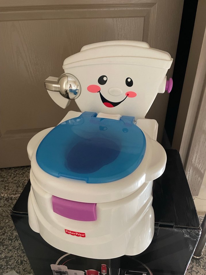 Fisher-Price bebek tuvaleti, gülen yüzü, mavi kapağı ve kullanımı kolay kolu ile çocukların tuvalet alışkanlığı kazanmasına yardımcı olur.
