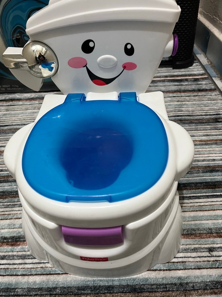 Fisher-Price çocuk tuvaleti, gülen yüz tasarımı, mavi kapak ve beyaz taban ile tuvalet eğitimi için uygundur. Erkek çocuk aparatı mevcut değil fakat sesi sifon kolu ve tuvalet kâğıdı aparatı mevcut. Kızın çok kolay alıştı bunun sayesinde.