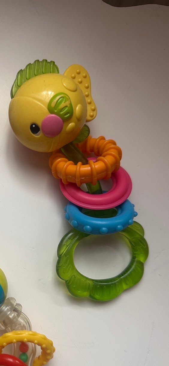 Çok renkli, farklı dokulu halkalar ve balık şeklinde üst kısmı olan diş kaşıyıcı ve çıngırak oyuncak. Diş etlerini rahatlatmaya ve oyun keyfi sunmaya uygundur.