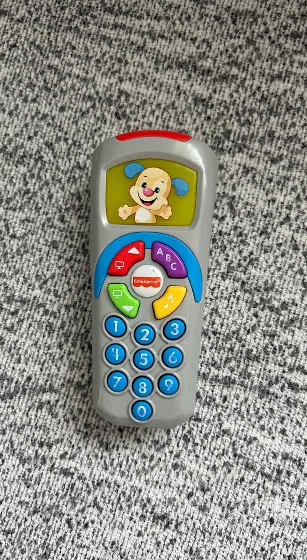Renkli düğmelere ve sevimli köpek resmine sahip Fisher-Price eğitici oyuncak telefon, çocukların sayı ve harf öğrenimini destekler.
