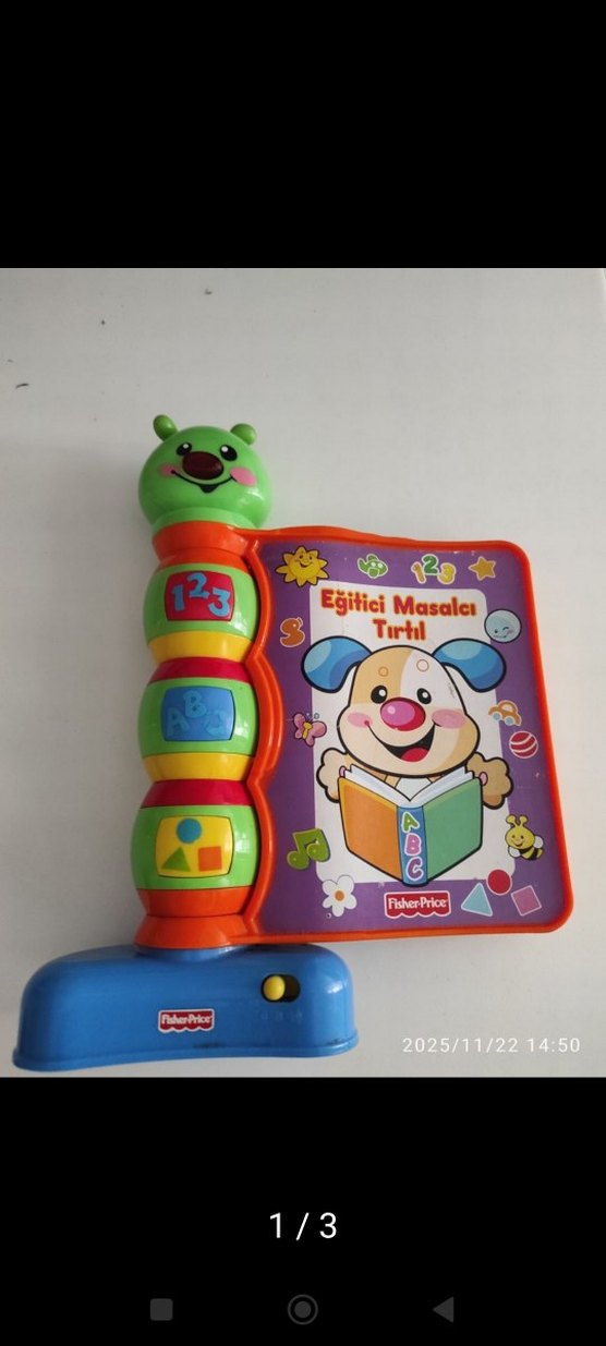 Renkli Fisher-Price eğitici oyuncak, tırtıl şeklinde, sayılar ve şekiller öğrenmeyi sağlayan interaktif düğmeler ve masal kitabı içerir.