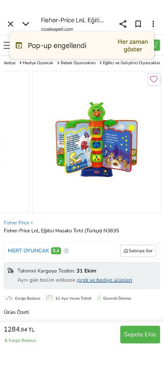 Fisher-Price markalı, Türkçe hikayeler anlatan renkli ve etkileşimli tırtıl şeklinde eğitici oyuncak.