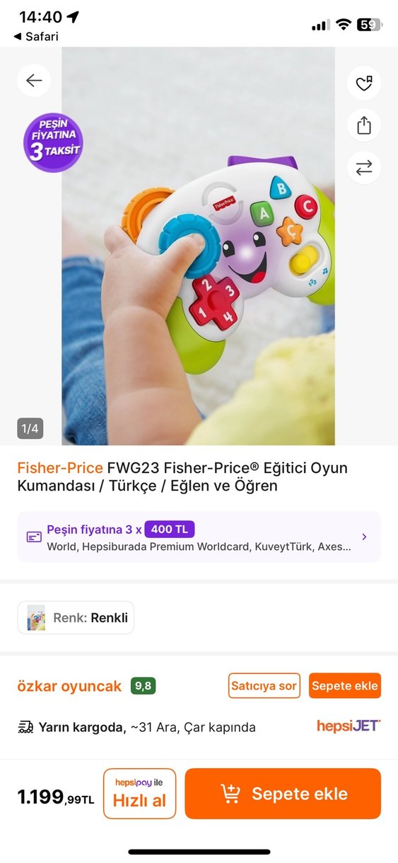 Renkli Fisher-Price eğitici oyun kumandası, Türkçe harf ve sayı tuşları ile öğrenmeyi eğlenceli hale getirir.