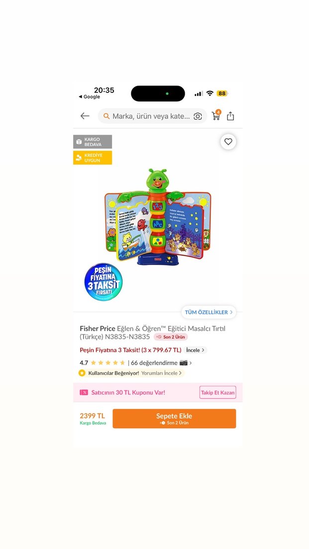 Fisher Price Eğlen & Öğren Egitici Masalcı Tırtıl, çocukların öğrenmesini destekleyen renkli ve etkileşimli bir eğitim oyuncakıdır. Sorunu yoktur çalışıyor pil de içinde var aynısından hediye geldiği için satıyorum kutusu yırtılmıştı o yüzden attım ama hasar görmeyecek şekilde gönderim yaparım,güncel fiyatını attım o yüzden uygun yazdığımı görebilirsiniz gönül rahatlığı alabilirsiniz üründe iade yoktur.