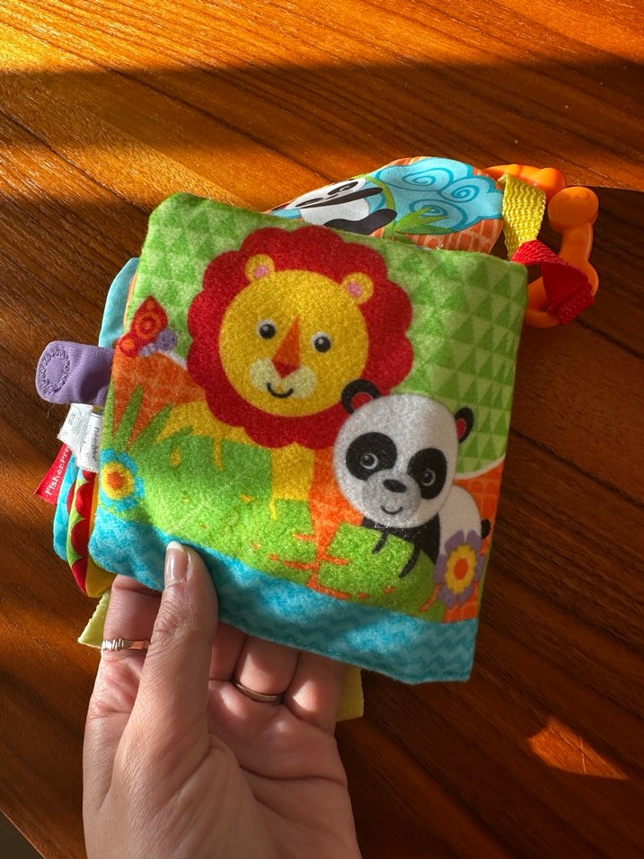 Aslan ve panda gibi hayvan resimleri içeren renkli, yumuşak eğitici kitap, erken öğrenme ve duyusal oyun için tasarlanmıştır. Çok iyi ve temiz durumda
