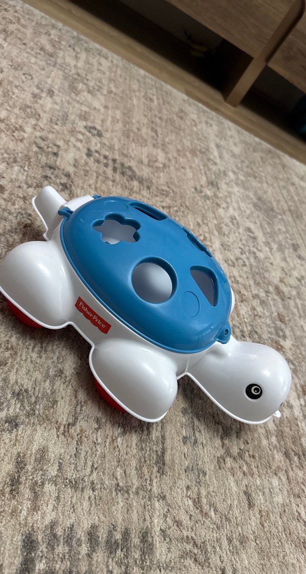 Mavi ve gri renkli Fisher-Price kaplumbağa şekilli eğitici oyuncak, çocukların şekilleri kabuk üzerindeki boşluklara yerleştirerek öğrenmesini sağlar.