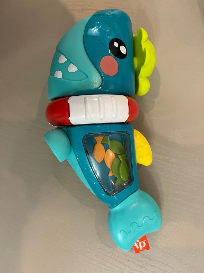 Fisher Price marka köpek balığı oyuncağıdır. Üzerinde kaplumbağası ve dönen can simidi de vardır. Ayakları da olduğundan yatay olarak ayakta durabilmektedir. Hiçbir sorunu yoktur.