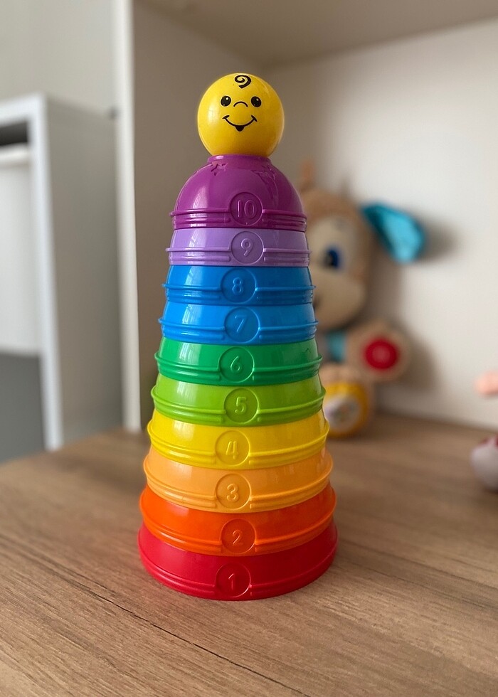 Tertemiz az kullanıldı, hepsi birbirine geçmeli, numaralı, büyük bir kule yapılıyor. Hem renkleri öğrenmeye destekli hemde kuleyi yıkmak için emeklemeye yardımcı :) üzerinde ki top çıngıraklıdır