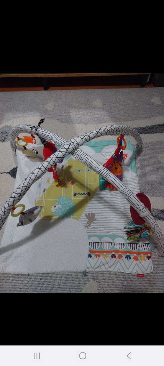 Yumuşak tekstil malzemeden, renkli ve asmalı oyuncaklı bebek oyun halısı.