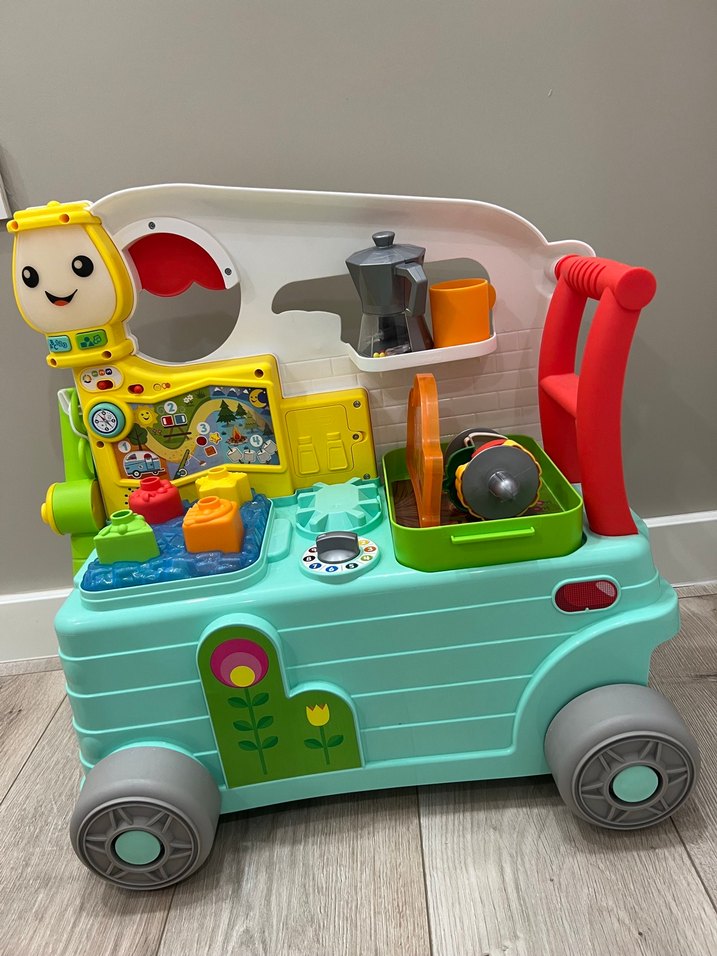 Renkli oyuncak yürüme arkadaşı düğmeler, dişliler ve şekillerle etkileşimli oyun sağlar. Dayanıklı sap ve tekerleklerle kolay hareket ettirilir. İngilizce Türkçe seçeneği mevcuttur. Sadece son resimde görülen bisküvi parçası eksiktir başka bir problemi yoktur .