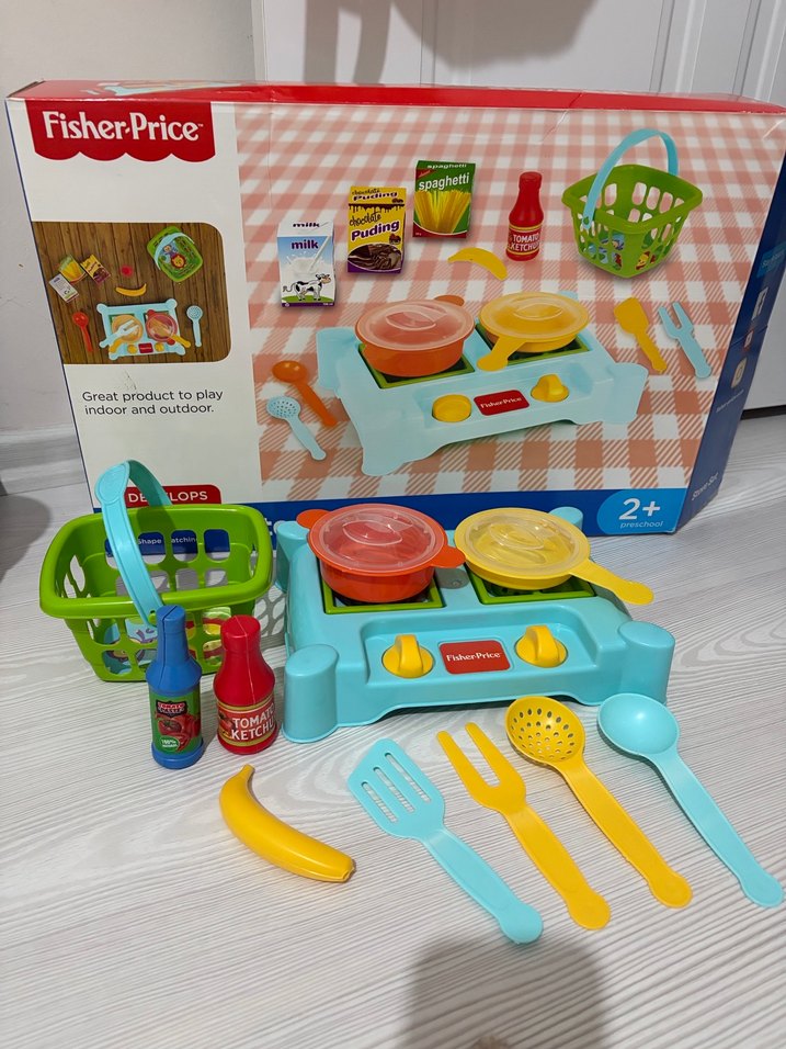 Fisher-Price renkli eğitici mutfak oyuncağı seti, ocak, tencereler, mutfak gereçleri. 2 yaş ve üzeri çocuklar için uygundur. Meyve kesme tahtası ve meyveler hediyedir.