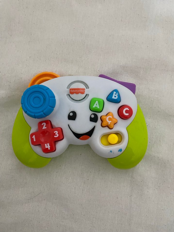 Renkli ve eğitici oyun konsolu şeklinde oyuncak, harfler, sayılar ve şekiller içeren düğmelerle çocukların öğrenmesini destekler. Üzerinde bazı yazılar hafif silinmiş o yüzden fiyatı uygun tutuyorum.