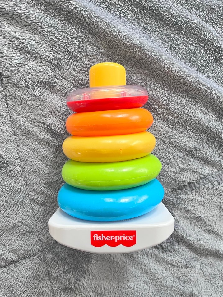 Fisher-Price markalı, renkli halkalardan oluşan eğitici oyuncak, motor becerileri ve renk tanımayı destekler.