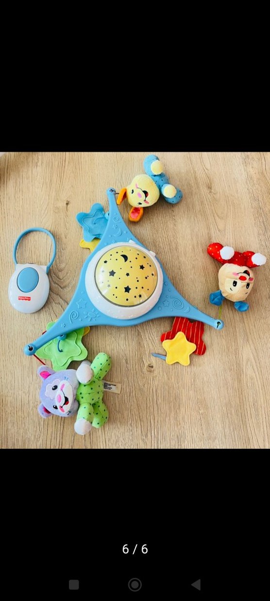Asılı peluş hayvanlar ve yıldız desenli ışık projektörü bulunan renkli müzikli bebek oyuncağı. Uzaktan kumandalı.