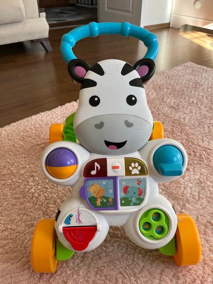 Renkli zebra desenli bebek yürüteci, interaktif düğmeler ve tekerleklerle yürümeyi öğrenmeyi destekler. Fonksiyonları tam çalışır şekilde olup sadece etiketlerinde sökülenler var