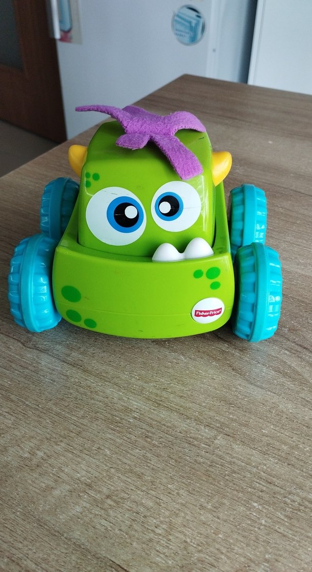 Fisher-Price markalı, büyük mavi tekerleklere ve eğlenceli gözlere sahip renkli yeşil eğitici oyuncak arabadır. Emekleme arkadaşı, üstüne basıldığında ilerler.