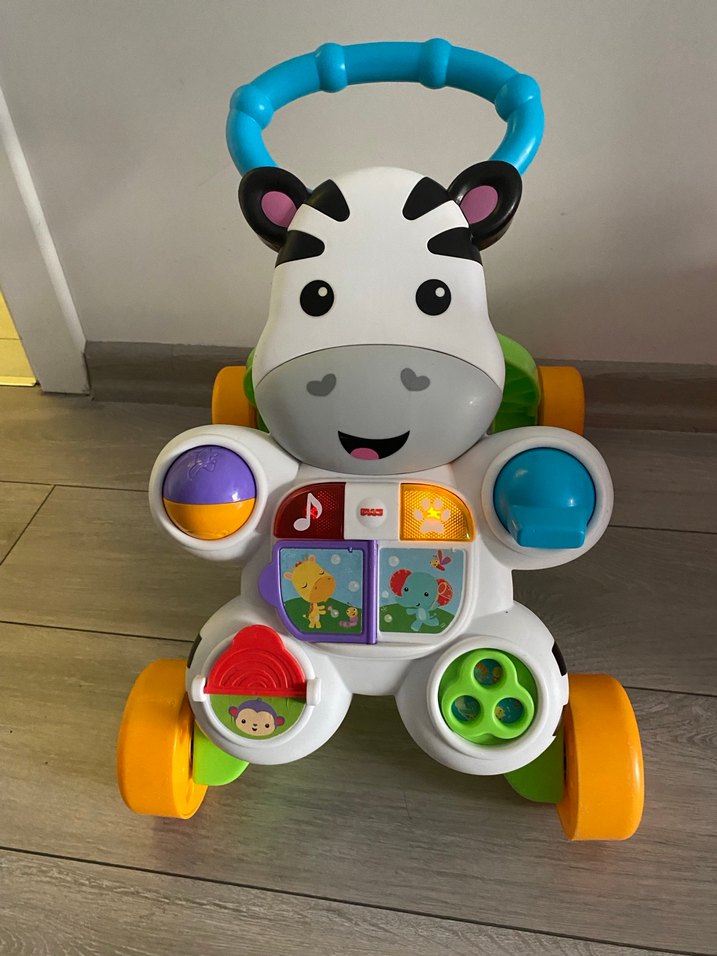 Zebra şekilli, renkli bebek yürüteci, etkileşimli düğmeler ve sağlam tekerleklerle donatılmıştır. Yürümeyi destekler.
