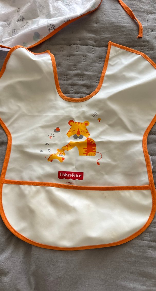 Turuncu kenarlıklı beyaz bebek önlüğü, üzerinde baskılı kaplan deseni bulunur. FisherPrice markalı, beslenme sırasında koruma sağlar.