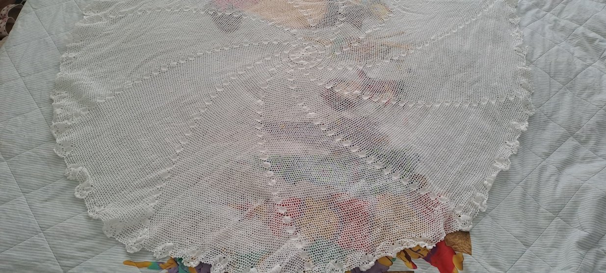 Bohem tarzı dantel örgü masa örtüsü, zarif çiçek desenleri ve dalgalı kenarlarla el işçiliği dokunuşu sunar. fiskos masa ortusu el emegi dantel sifir urun tamami 118 cm yuvarlak