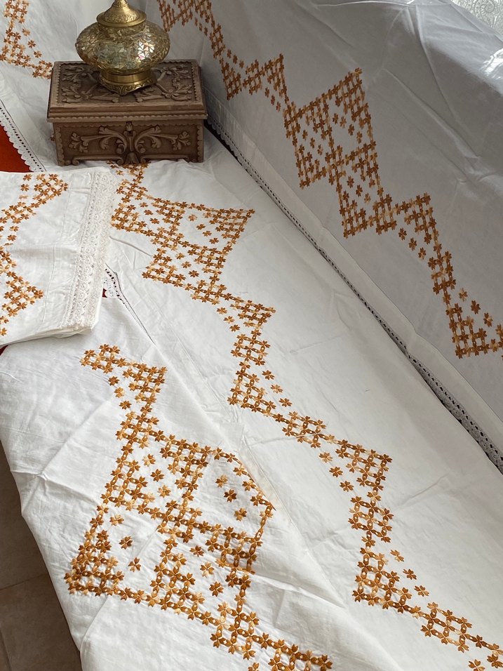 Fıstık iğne nakışı,bir etek bir kapak bir uzun yastık,bir kırlentten oluşuyor.Kahverengi ile işlenmesi ayrı bir ağırbaşlılık katıyor.Az görülmüş bir model pike yatak takımı yapılırsa da harika olur.Tüm zerafeti ile…