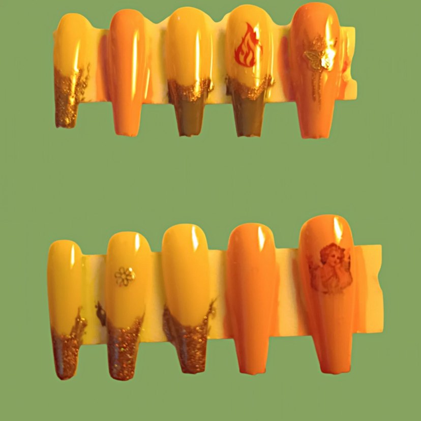 Altın detaylar ve çeşitli küçük desenler içeren renkli tırnak süslemeleri. gold sim detaylı ve melek/ateş figürlü özel tasarım press-on nail seti. Tabut (Coffin) formunda, uzun ömürlü ve şık. Hashtagler: #pressonnails #taktırnak #nailart #saritirnak #melekfigürlü #elyapımıtırnak #kelebeklitirnak #metaliktirnak #partistili #takmatirnak #naildesign