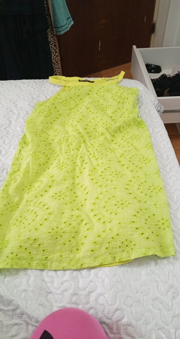 Fıstık yeşiliı renkli, askılı ve dantel detaylı kız elbisesi. Straplez yakalı, bol kesim ve bohem tarzda, sentetik kumaştan üretilmiştir.