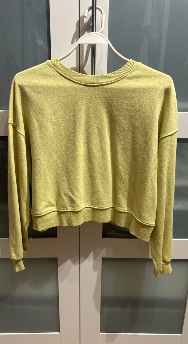Fıstık yeşili renkli, bisiklet yaka ve uzun kollu kadın sweatshirtü, rahat crop kesime sahiptir. Yumuşak ve sıcak kumaştan üretilmiş, desen içermeyen günlük kullanıma uygundur.