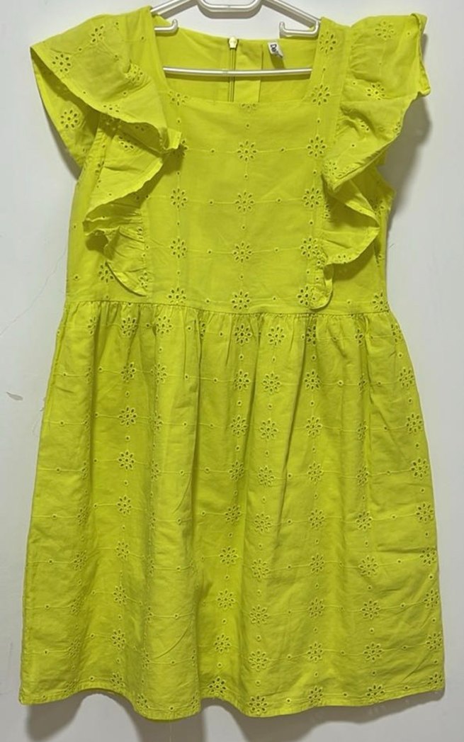 Fıstık yeşili renkli, nakışlı ve fırfırlı detaylara sahip, askısız ve bol kesim kız elbisesi. Yumuşak sentetik kumaştan üretilmiştir. Defacto marka boyu:72 cm dir