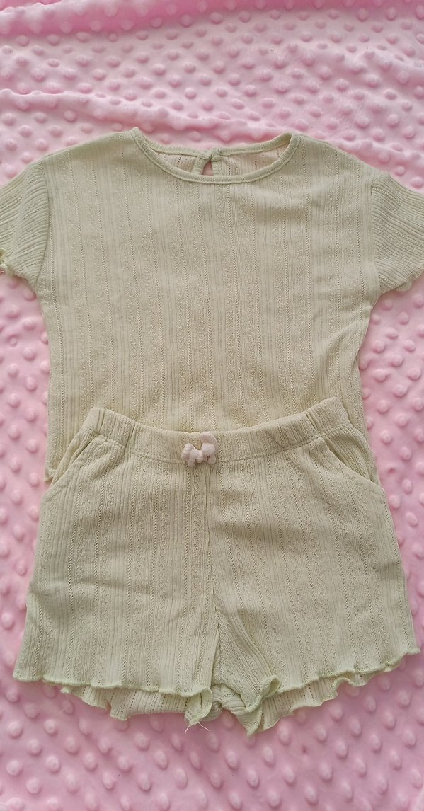 Fıstık yeşili, kısa kollu ve örgü dokulu bebek kıyafet takımı, yumuşak ve rahat bir kullanım sunar. Şortu ceplidir