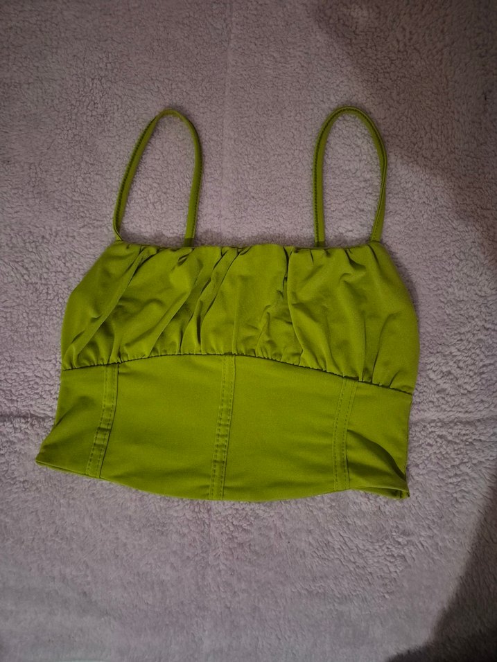 Yeşil renkli, pilili detaylara sahip, askısız ve vücuda oturan midi uzunluğunda sentetik kumaştan yapılmış büstiyerdir. Dış mekan kullanımı için uygundur.